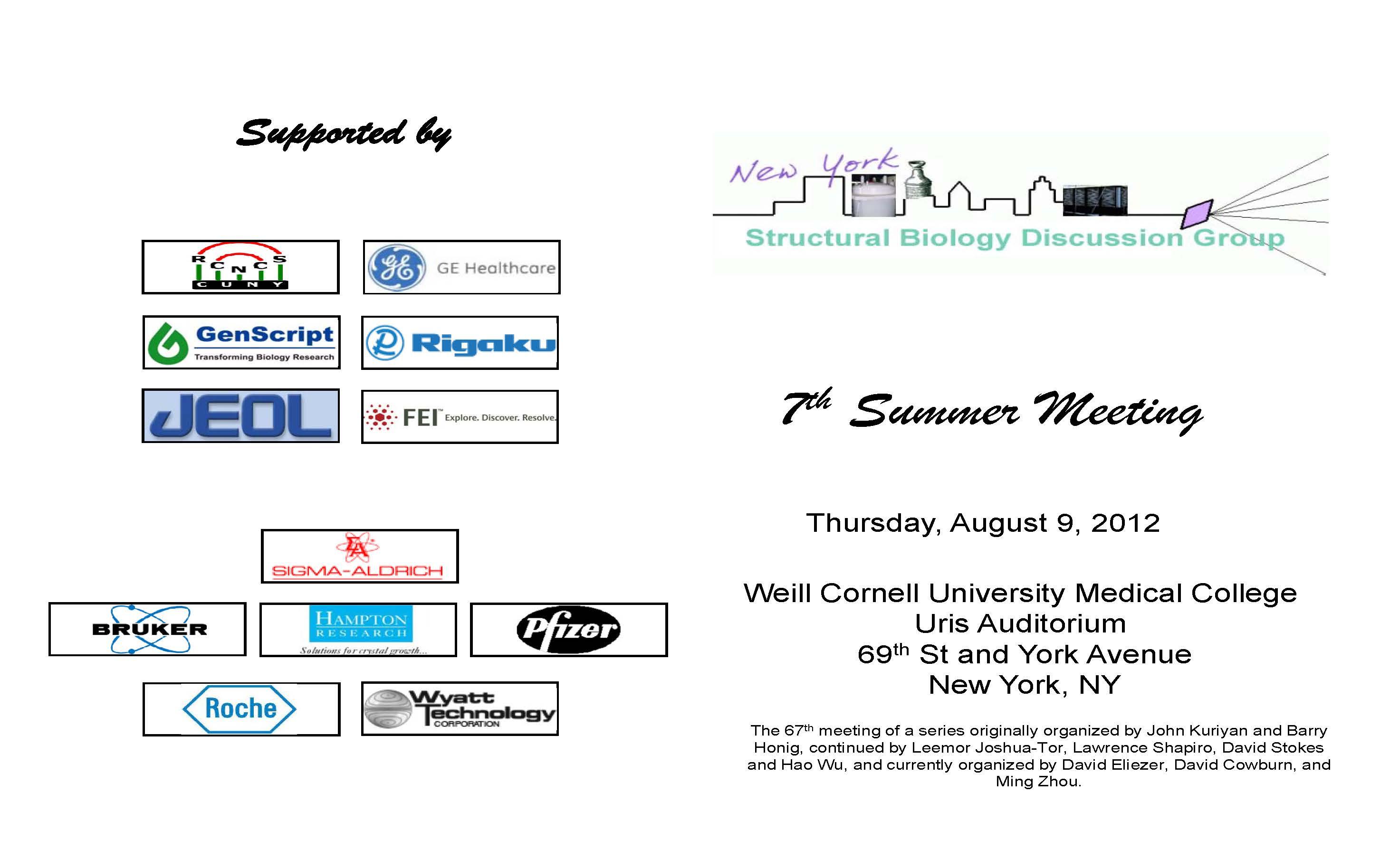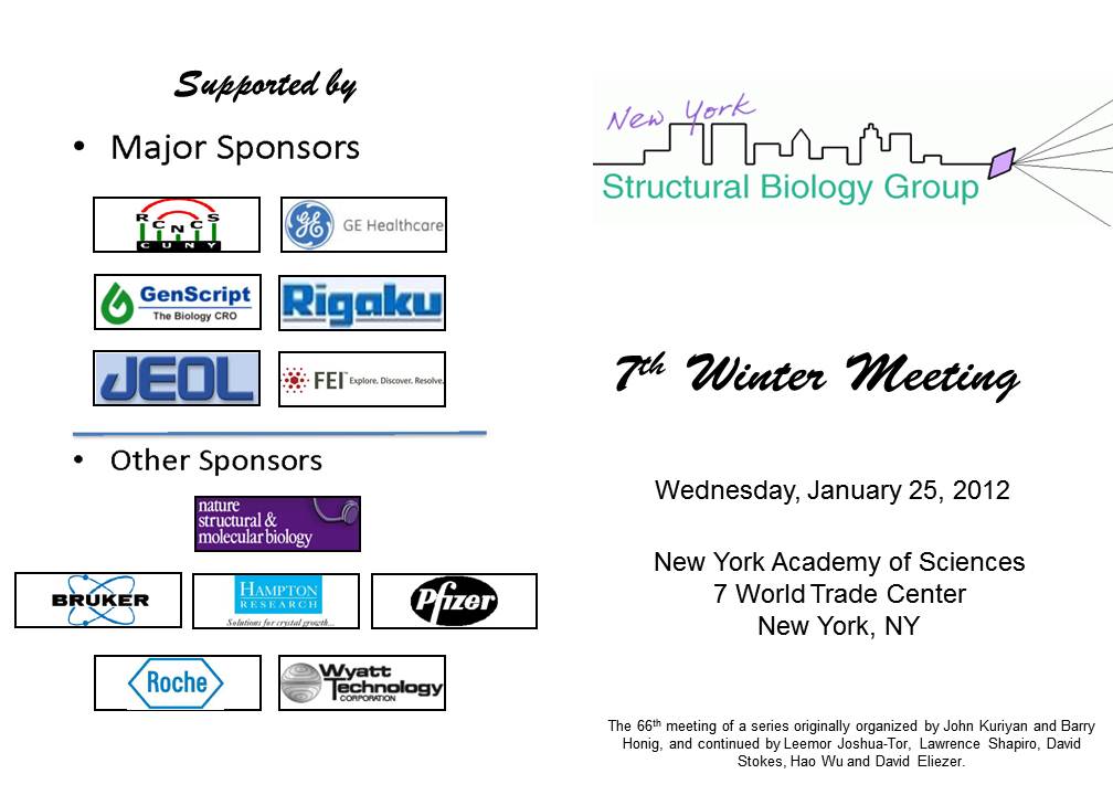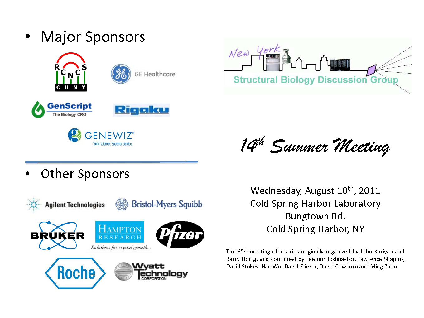 Eric Greene, Columbia University Rinku Jain (Aggarwal Lab) Mount Sinai School of Medicine Wei-Li Liu, Einstein College of Medicine Ming-Ming Zhou, Mount Sinai School of Medicine Joel Butterwick (MacKinnon Lab), Rockefeller University Steven Ealick, Cornell University John Hunt, Columbia University Michael Ward, New York University David Case, Rutgers University Andisheh Abedini (Schmidt Lab), New York University School of Medicine David E. Shaw, D.E. Shaw Research Noel Carrascal, Stony Brook University Jaehyun Cho, Columbia University Tanvir Shaikh, Wadsworth Center