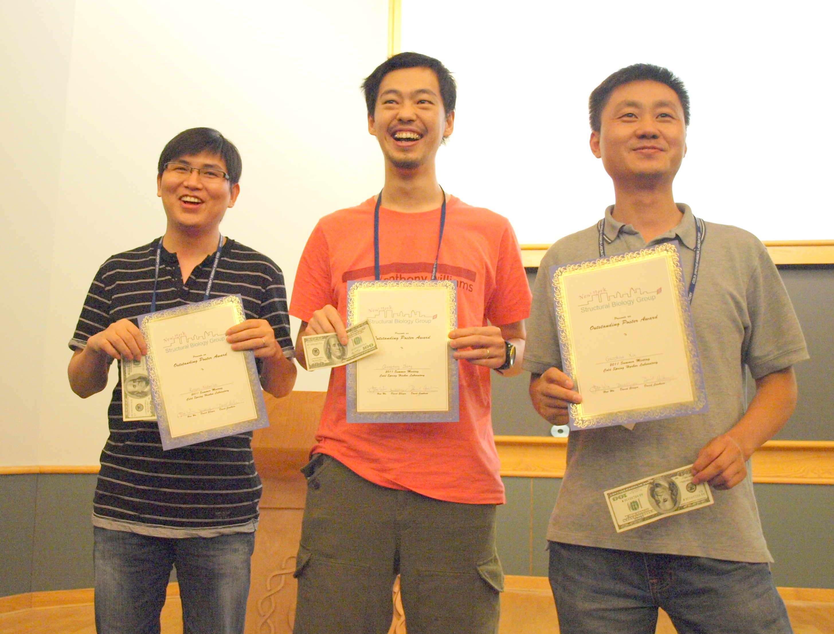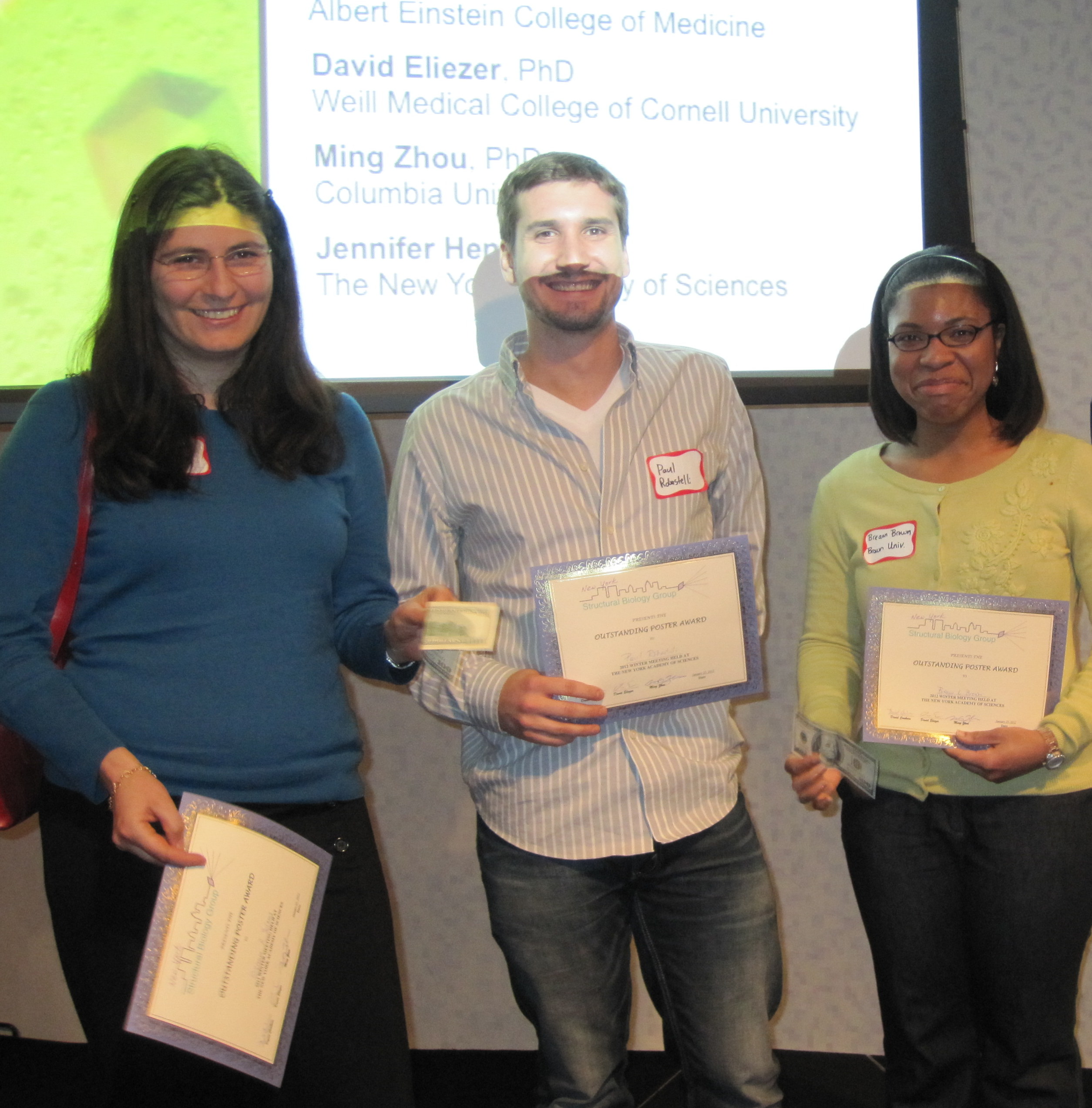 Illustration 2: Poster Awardees, presented by Suraj Manrao. Romina Mancusso (with G. Glenn Gergorio, Qun Liu, and Da-Nang Wang -- NYU Med) "Structure and Mechanism of a bacterial sodium-dependent dicarboxlate transporter" : Yu Zhang (Rutgers) "Structural basis of transcription initiation" : Yogesh Gupta (with Aneel Aggarwal, MSSM) "Structural insights into the assembly and shape of type III restriction - modification EcoP151 complex by SAXS"